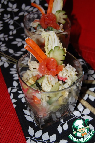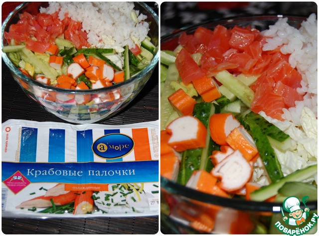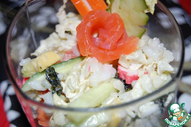 | Очень вкусный, легкий и острый салат с рисом и крабовыми палочками. Для всех любителей ролkов, которым неохота их катать. |