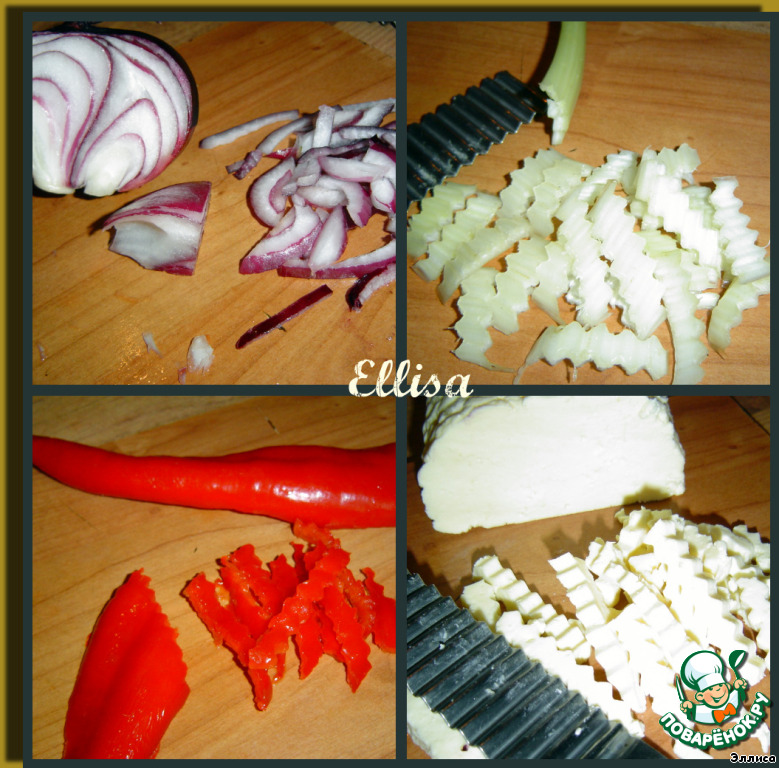 Нарезаем длинными полосками черешки сельдерея, болгарский перец, брынзу, репчатый лук.