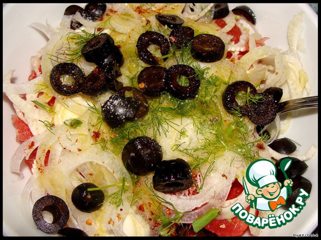 Оливки режем колечками, зелень фенхеля тоже покрошим и - в салатницу.