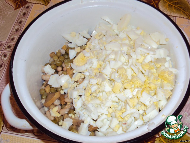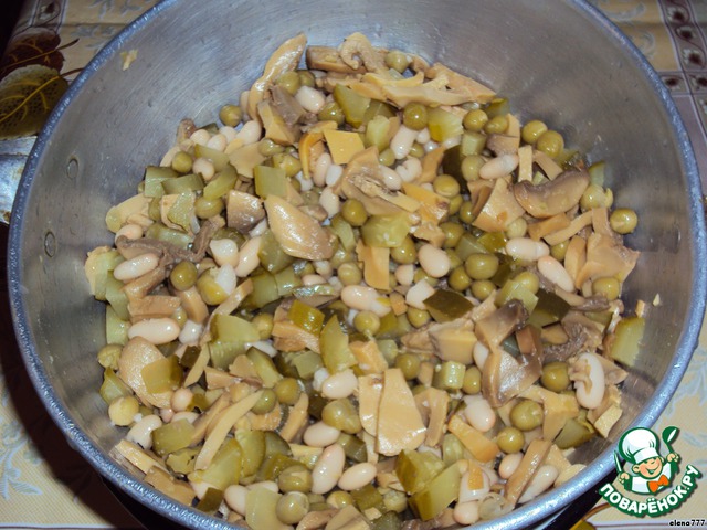 С консервированных грибов, горошка, фасоли слить жидкость, сбрызнуть соком лимона, добавить порезанные солёные или маринованные огурцы, горчицу, перемешать.