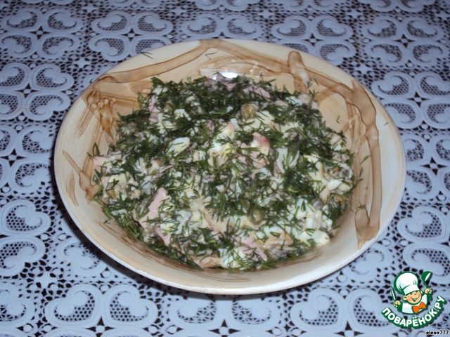 Посыпать порезанной зеленью укропа. Салатик очень понравился моей дочке Юлечке, когда я её спросила какое дать ему название, дочка ответила: "Не знаю"...а потом, подумав, добавила: "Раз не знаю, значит "Незнайка". Вот откуда взялось название этого салата.