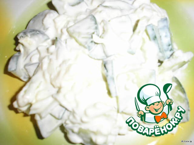 Перемешать яйца с огурцом. Солить и заправлять салат нужно перед подачей на стол, т.к. огурцы дают сок, если постоят в майонезе.