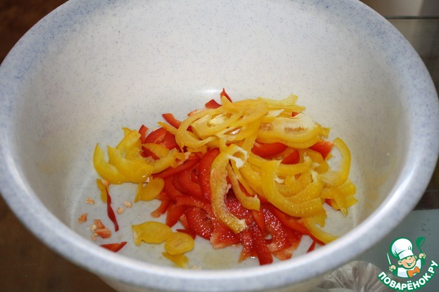 Добавляем зажаренный перец к овощам, перемешиваем. Вот и все, наш салат готов.