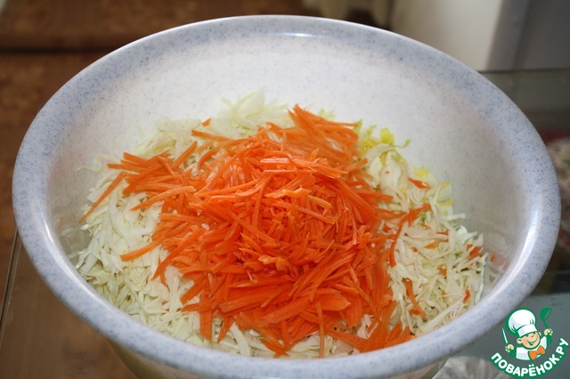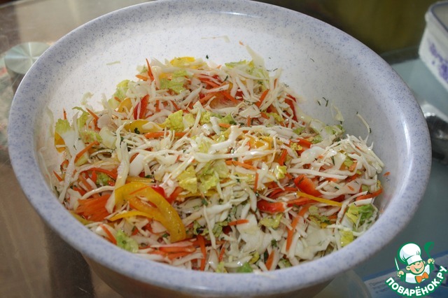 | Очень легкий в приготовлении салат. Обычно я добавляю еще огурец, но сегодня огурцы отсутствовали, а в магазин было лень идти по такому холоду :) У меня этот салат, как палочка-выручалочка: когда дома минимум продуктов, я делаю этот салат в разных вариациях - капуста-морковка, капуста-морковка-огу рец. Остальные ингредиенты добавляю, когда делаю этот салат после визита в магазин :) |