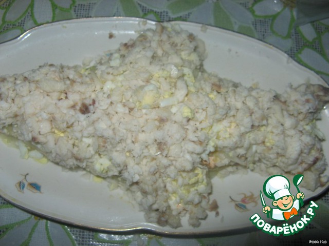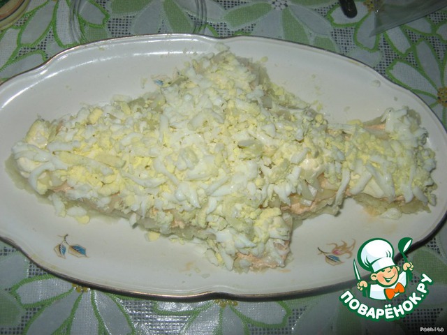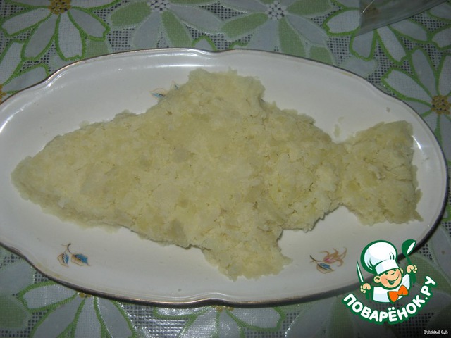 Картофель,яйца натереть. Лук и рыбу нарезать.
