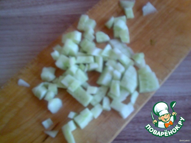 Огурец нарезать. Предварительно я сняла с него кожицу, т. к. она горчила.