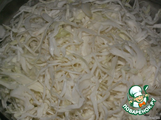 Капусту нашинковать тонкой соломкой, посолить, помять руками.
