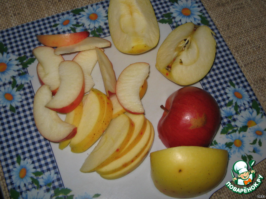 Яблоки, не очищая от кожуры, только от семенных коробочек, режем тонкими ломтиками.