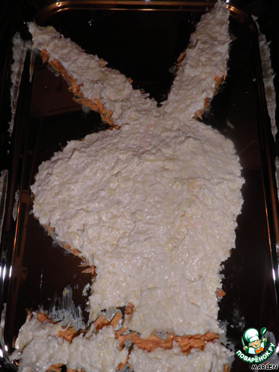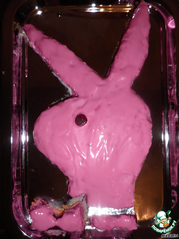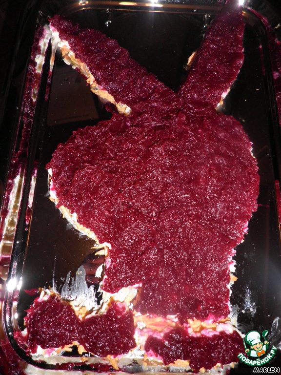 Сок свеклы перемешать с майонезом и аккуратно намазать на нашего "гламурного кролика". Из свеклы сделать глазик.