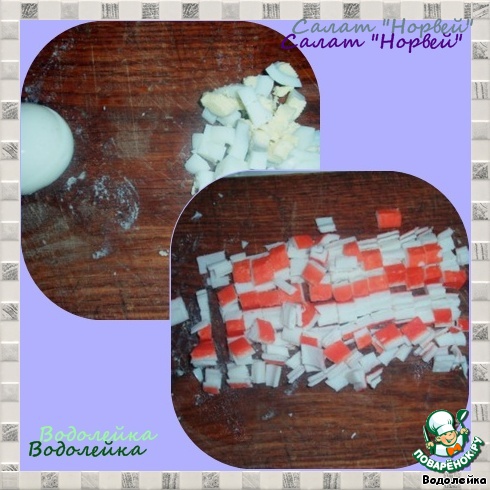 Режем яйца и крабовые палочки кубиками.