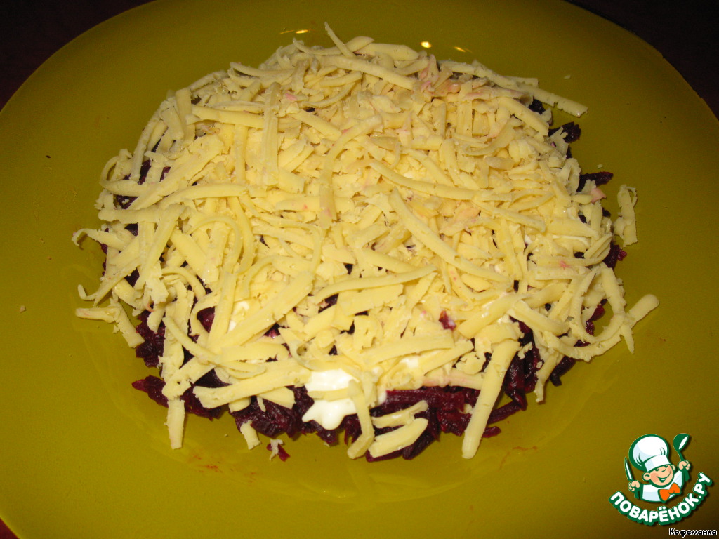 Слегка смазываем свеклу майонезом и укладываем сверху тертый сыр
