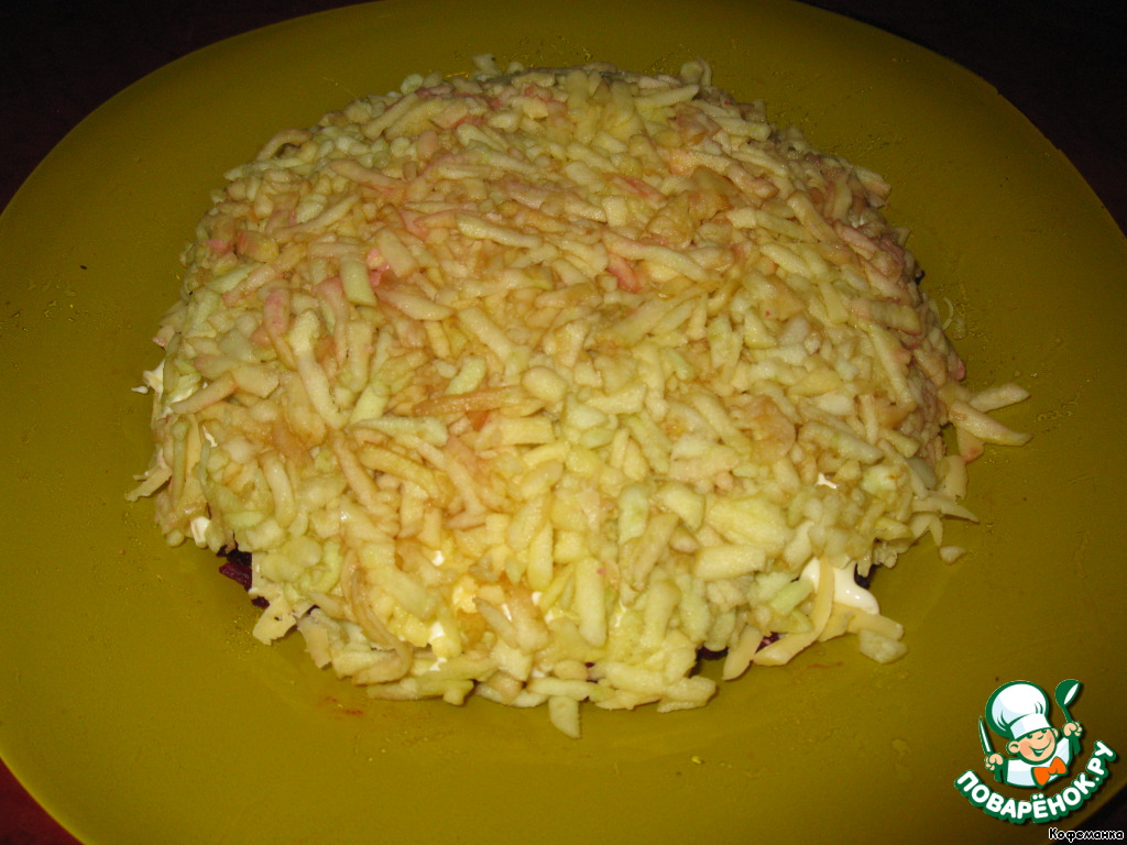 Тоже чуточку майонезика и тертые яблоки (я их сегодня не сбрызгивала лимоном, а просто быстро смазала майонезом и стала делать следующий слой)