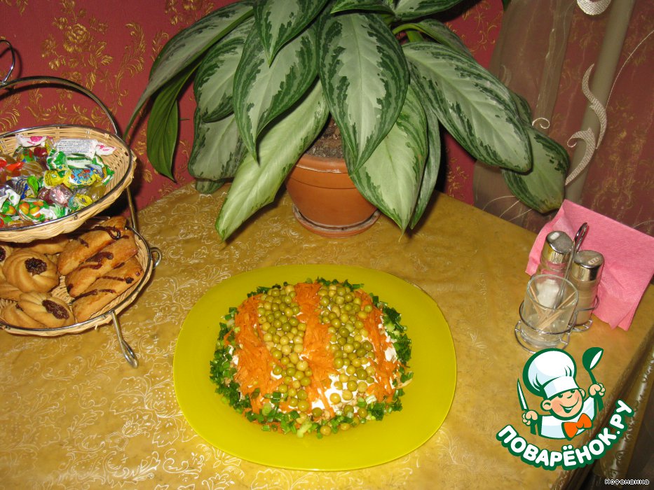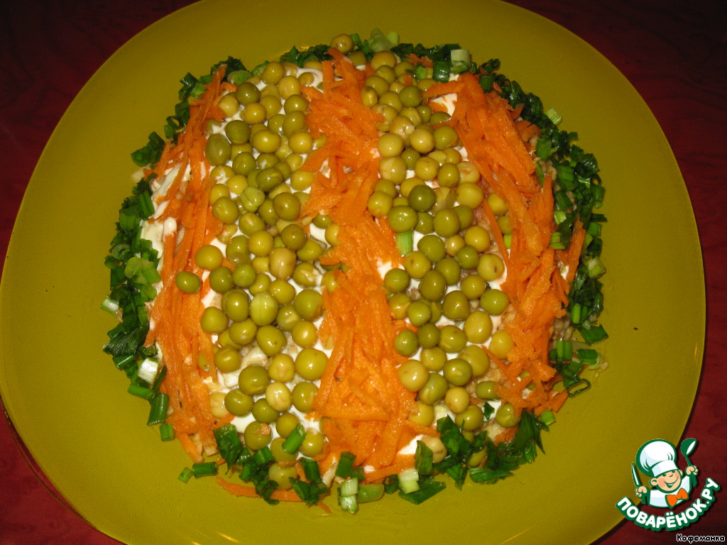 Верхний слой я сделала полосатым: полоска свежей морковки - полоска зеленого горошка.