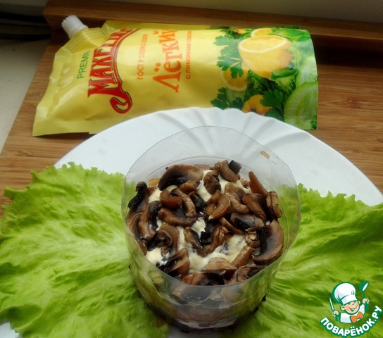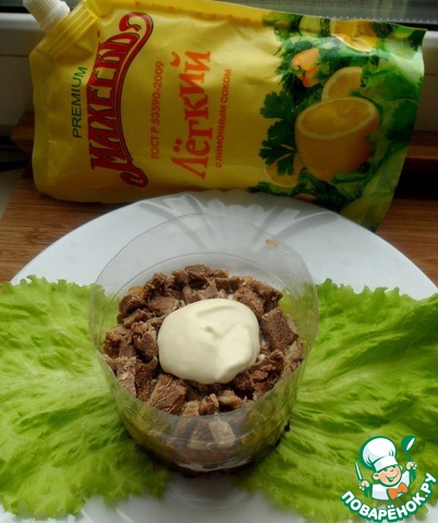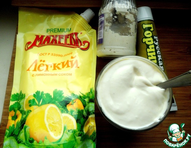 Делаем заправочный соус. Смешать 6 ст. л. майонеза Легкий с лимонным соком ТМ "Махеевъ" (обязательно с лимонным соком, если будете использовать майонез без сока лимона, то обязательно добавить сок в соус!) с 1ч. л. столового хрена и 1/2 ч. л. русской горчицы.