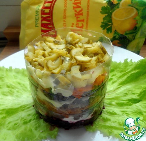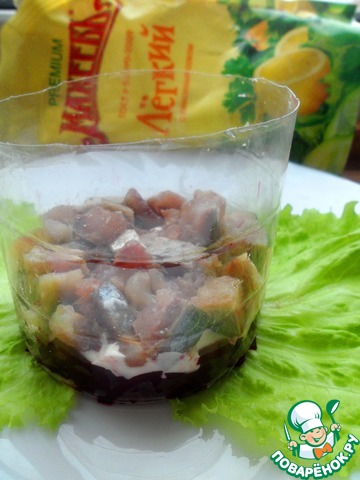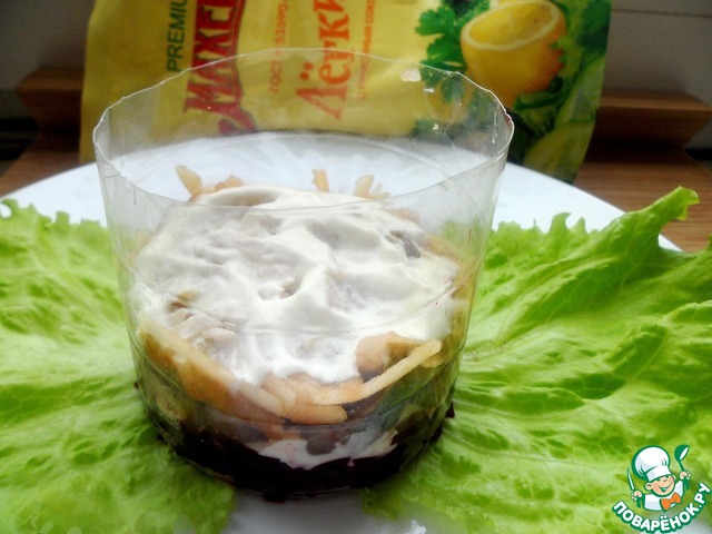 Для красивой подачи винегрета я вырезала из полуторалитровой пластиковой бутылки кольцо высотой 7 см. На тарелку положить 2 листа салата и поставить пластиковое кольцо. Первым слоем выложить свеклу и полить соусом, далее- малосольная селедка.