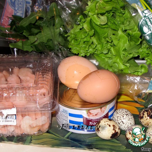 На блюдо с салатом выложить произвольно кусочки тунца, яйца, огурчики, креветки.