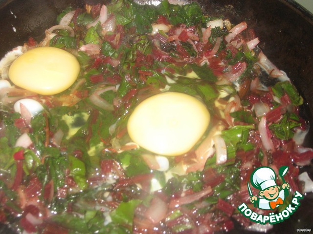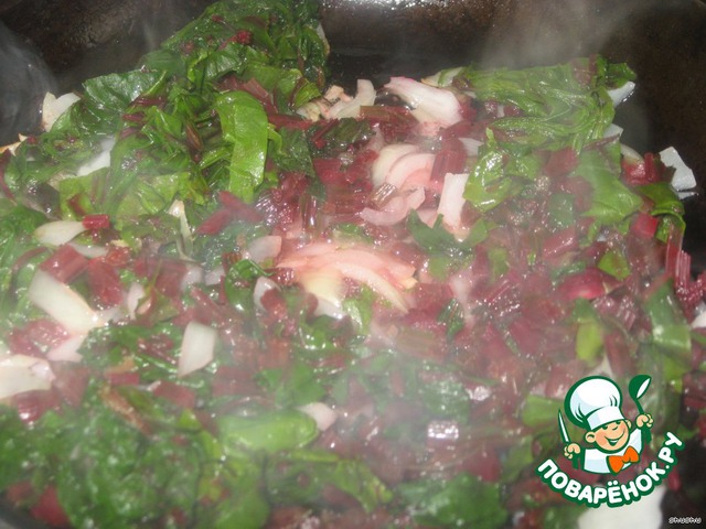 Отваренные листья мелко порезать и добавить к луку, посолить и поперчить по вкусу.Обжаривать до готовности, примерно 10 мин.
