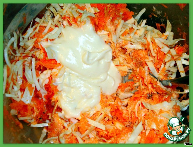 Морковь натереть. Капусту нашинковать. Чеснок мелко нарезать. Добавить тёртый сыр. Посолить и добавить майонез.