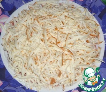 Сыр натереть на крупной терке. Также кладем поверх майонез.