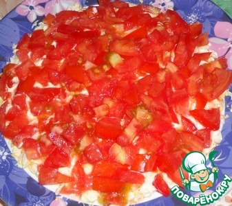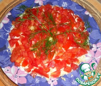Помидор порезать на кубики и выкладываем слоем. Украсить зеленью по желанию.