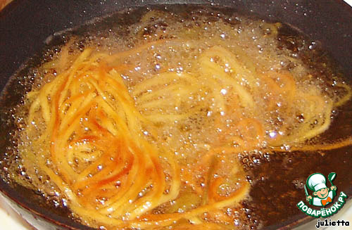 Затем слегка обжарить отварные макароны в большом количестве растительного масла (у меня было кукурузное). Не переусердствуйте - лапша должна остаться достаточно мягкой и лишь местами подсушенной.