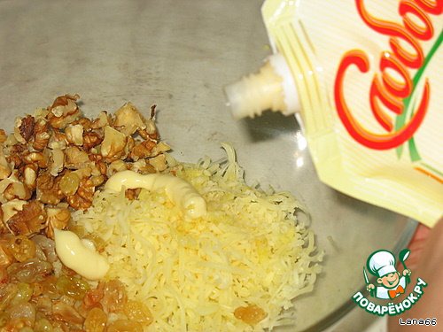 Сыр смешайте с изюмом, орехами, чесноком и половиной нормы майонеза. Если нужна соль, посолите.