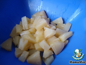 Обычно в таких банках ананасы нарезаны кольцами. Режем их на небольшие кусочки и скидываем в тарелку.