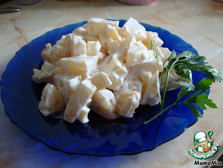 И получаем вот такое чудо за совершенно короткое время. Гости удивятся, чеснок поможет разыграть аппетит, салатик не сытный, зато оригинальный и сочный!