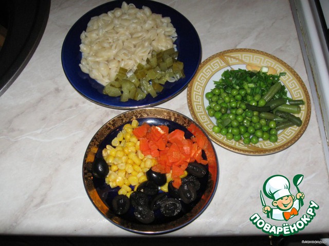 Мороженый зеленый горошек отварить(если летом, то естественно, взять свежий). Макароны сварить и морковь тоже. Все это порезать(кроме макарон