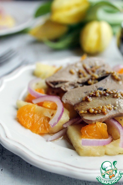 На терелку выложить основу (фрукты с луком), а сверху печень, нарезать её продольными полосками,