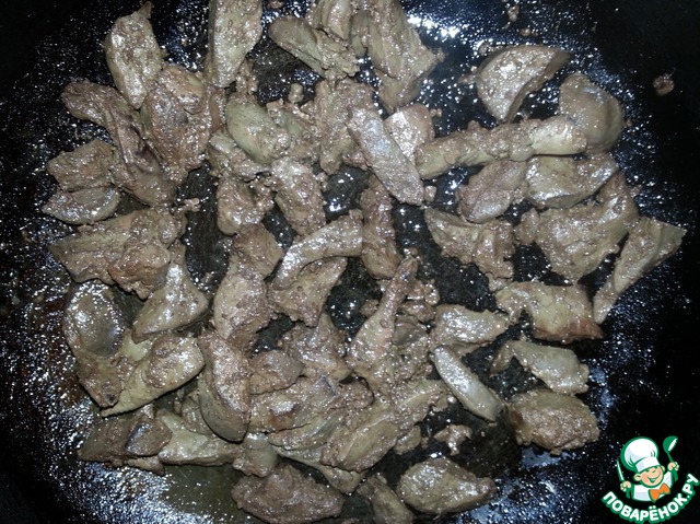 Разогреть сковороду, добавляем 20 мл подсолнечного масла, кладем печень, солим и обжариваем печень до готовности
