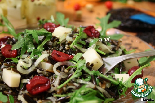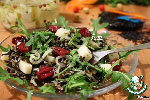 В отдельной чашке смешать рис, рукколу, сыр, вишню, лук.