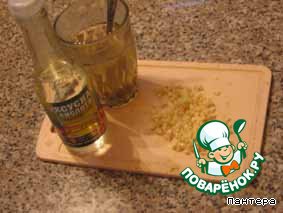 Приготовить заправку: измельчить любым способом чеснок, 2-3 зубочка. В небольшом количестве холодной кипяченой воды развести соль, перец, уксус (у меня 0,5 стакана воды, 2 небольших щепотки соли, перец на кончике ножа, уксус добавляю понемногу, пробуя на вкус). Должна получиться остренькая водица.