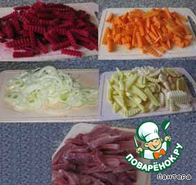 Мясо и овощи порезать равными брусочками.
