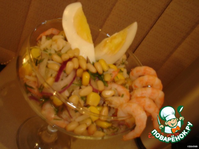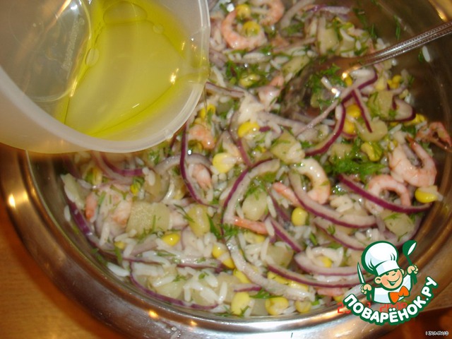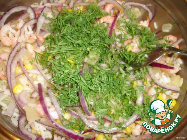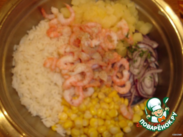 все ингридиенты поместить в большую миску: лук+ананасы+креветки+кукурузу.