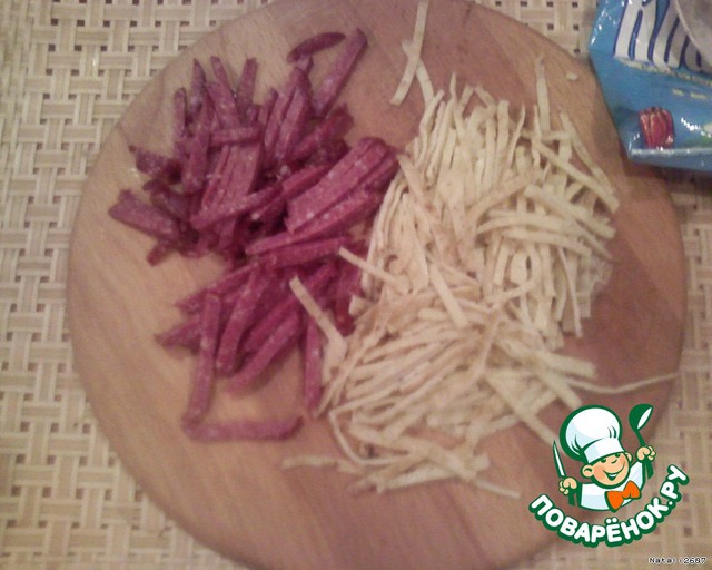 Нарезать лук и обжарить на масле. Нарезать соломкой колбаску и блинчики. Все смешать и салат готов!