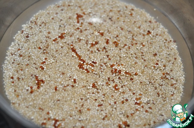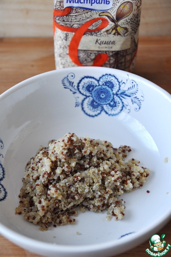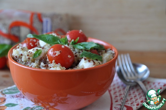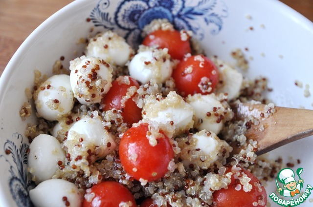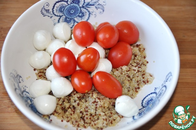 Добавляем к киноа шарики моцареллы "мини" и помидорки черри.