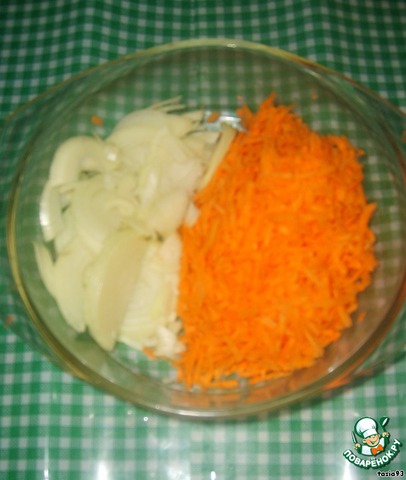 лук нарезать полукольцами, все обжарить в растительном масле.