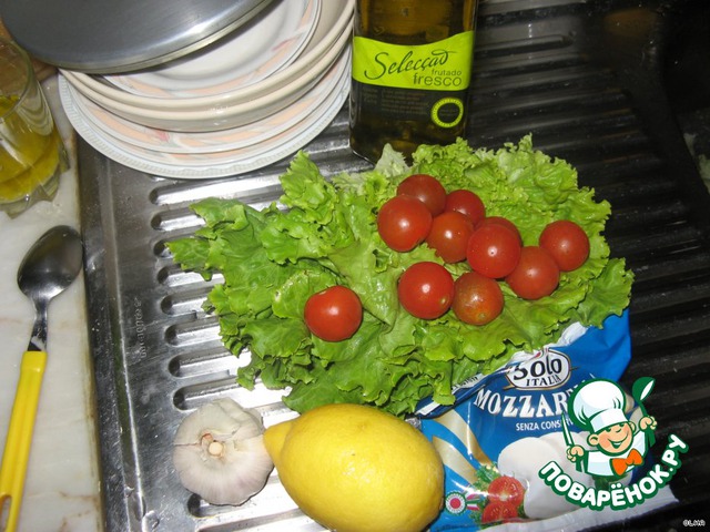 Для заправки смешиваем оливковое масло, лимонный сок и чеснок (через чеснокодавку). Все это хорошо перемешать
