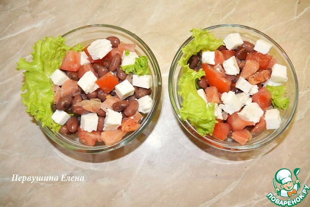Фасоль положить в отдельную чашку. Добавить нарезанные кубиками помидоры (без семян) и