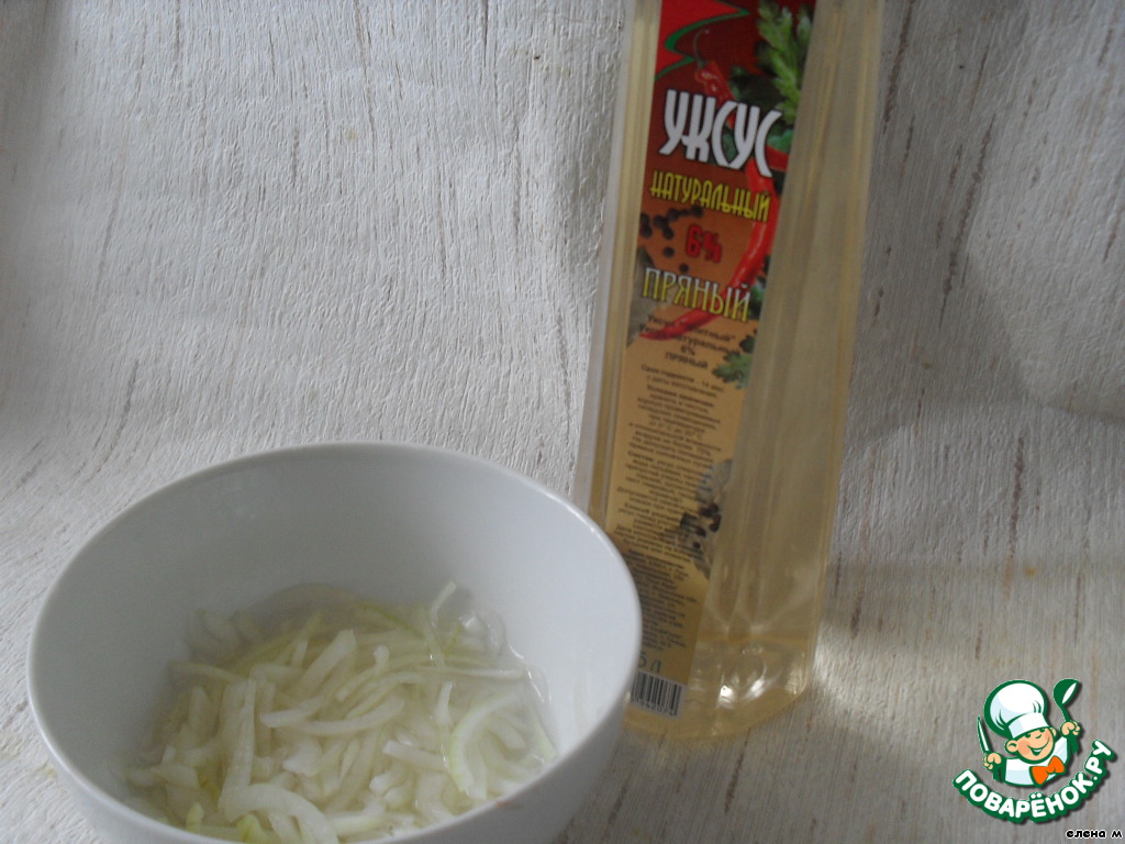 добавить замаринованный лук (уксус не выливать, а добавить к нему воду, он пригодится для заправки салата)