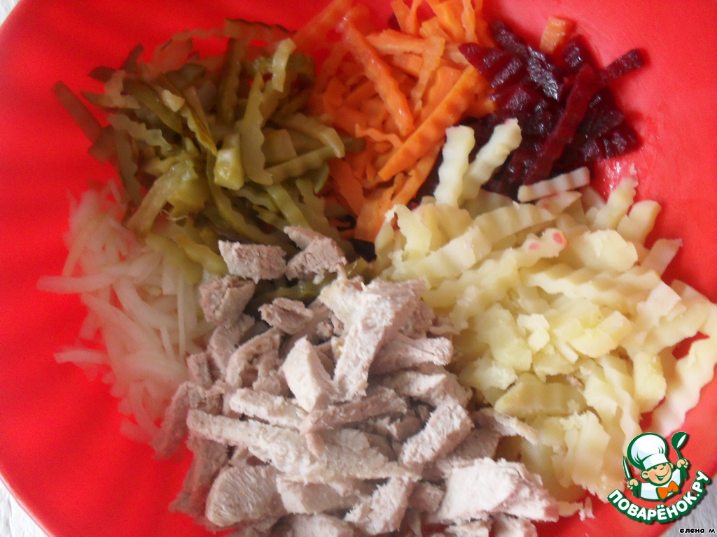 Морковь, корнишоны, картофель нарезать тонкими брусочками,