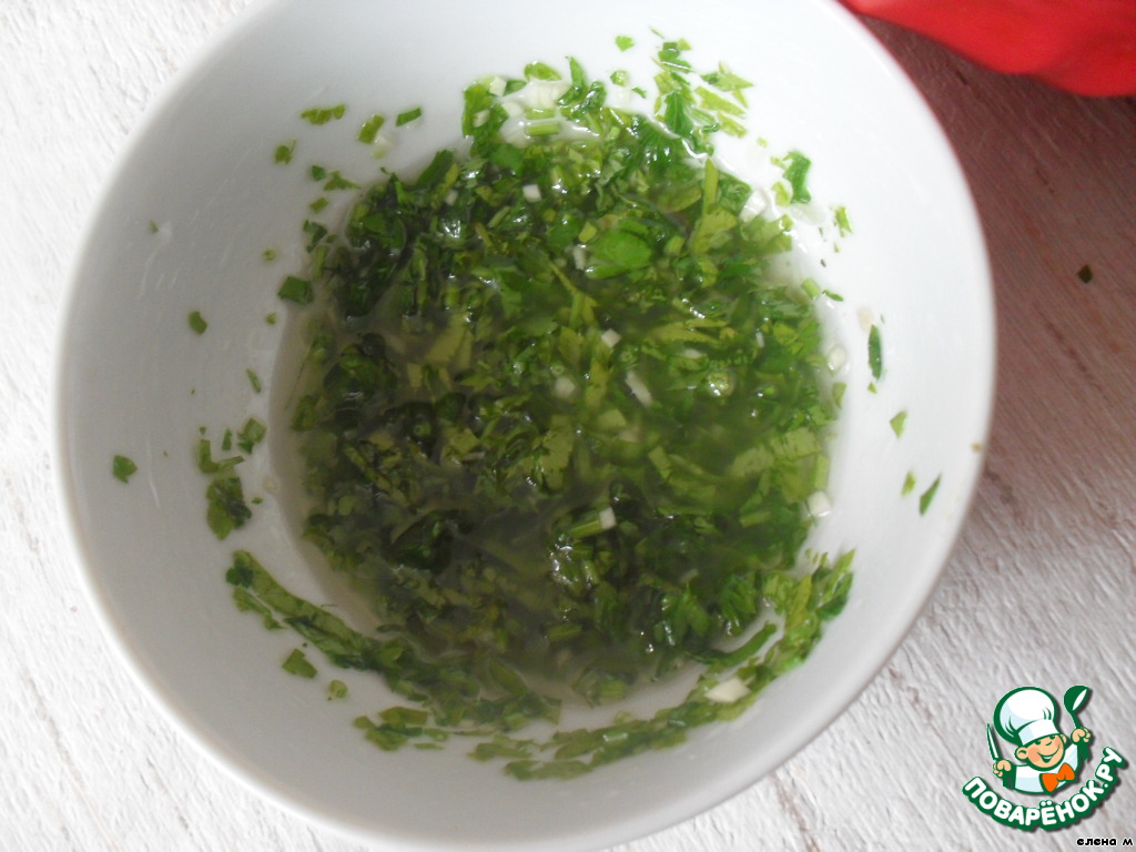Делаем заправку: зубчик чеснока мелко нарезаем, смешиваем с кинзой (петрушкой), слегка растираем ложкой, добавляем 3 ст.л. разведённого (оставшегося после лука)уксуса, растительное масло.