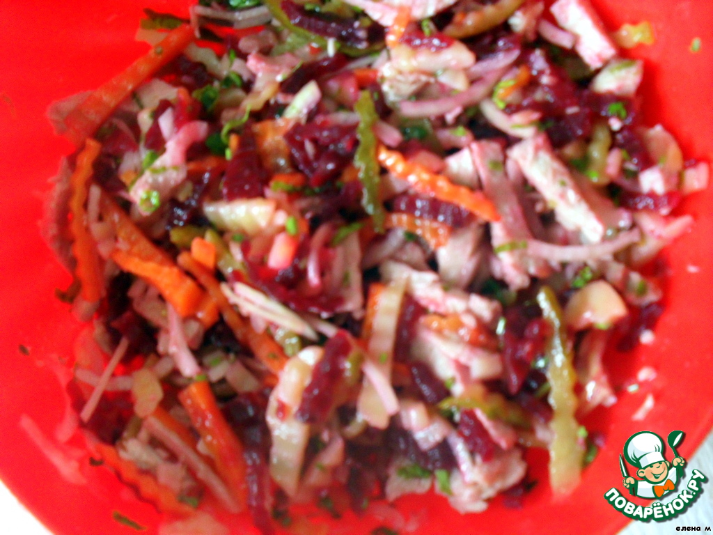 Свеклу нарезать тонкими брусочками, добавить немножко масла (чтобы меньше окрашивала остальные ингредиенты).