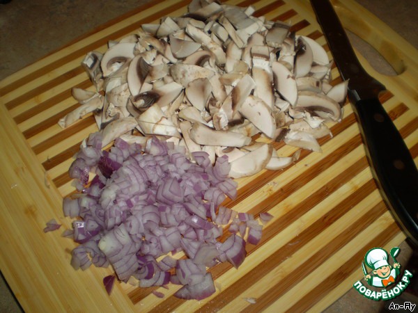 Шампиньоны нарезать соломкой, лук нарезать мелко, обжарить с грибами ~7мин, посолить и поперчить.