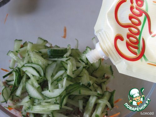 Свежий огурчик порезать на тонкие пластиночки и нашинковать.