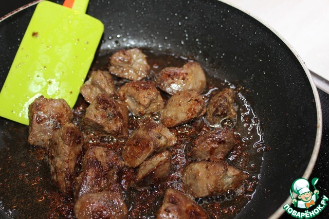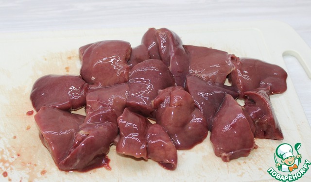 Печень промыть, обсушить, нарезать кусочками среднего размера