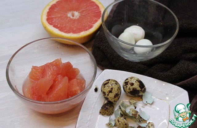 Половину грейпфрута очистить от шкуры пленок, оставить мякоть и сок. Перепелиные яйца отварить всмятку (1,5-2 мин) и также очистить
