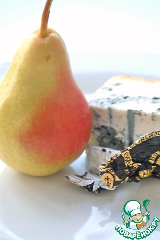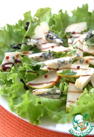 Салатные листья помыть, обсушить, порвать руками, выложить на блюдо. Горгонзолу нарезать небольшими кусочками, выложить на грушу. Посыпать листиками петрушки. (если необходимо, чуть посолить)