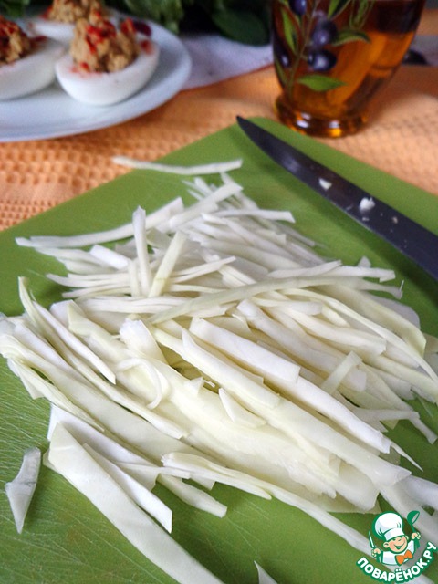Если используете молодую капусту, то просто порвать руками пару листиков. Если "взрослую", то режем соломкой.